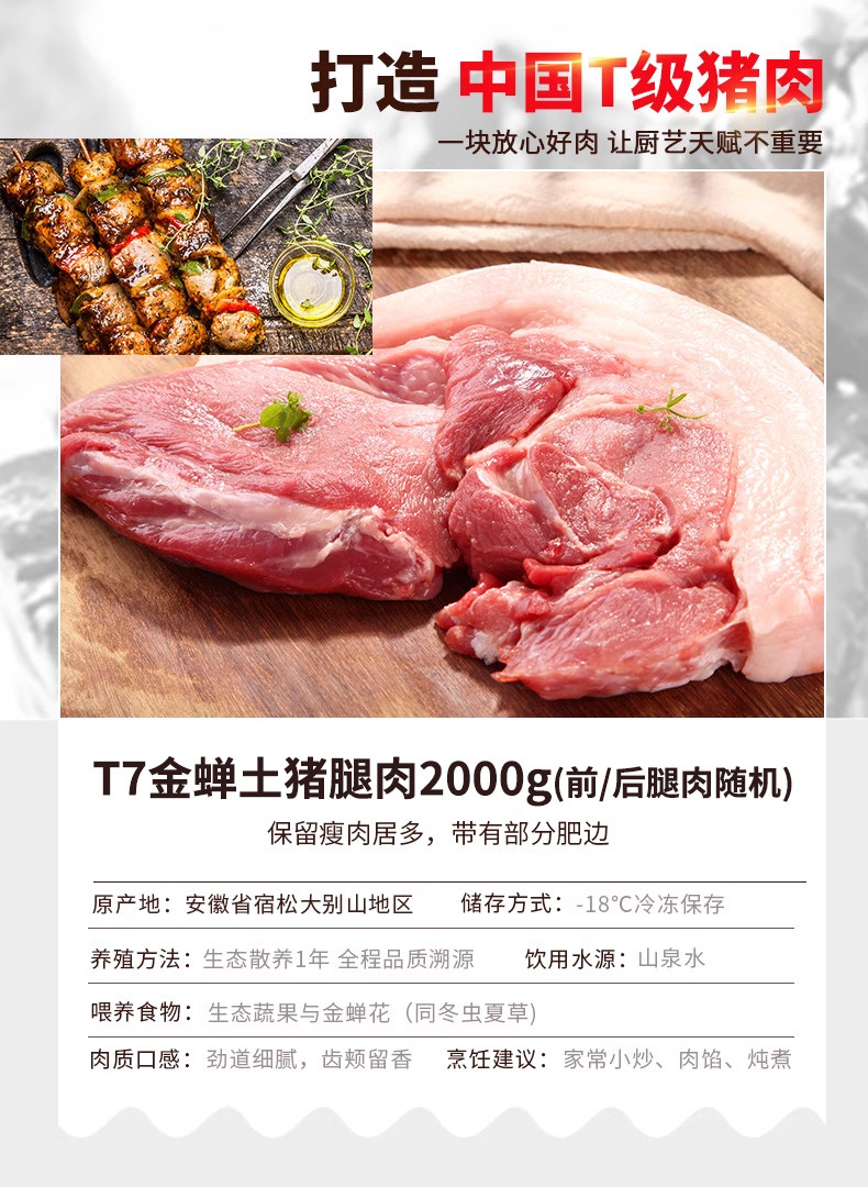 金蝉T7土猪肉4斤生猪肉腿肉冷冻土猪肉 农家散养新鲜猪肉烤肉